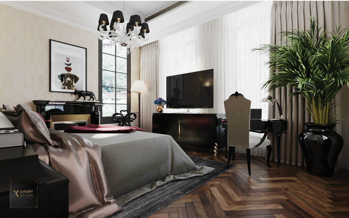Căn phòng được lát bằng sàn gỗ quý sang trọng, đẳng cấp. Các hệ tủ vừa giúp gia chủ thoải mái để đồ đạc, vừa góp phần trang trí thêm cho không gian. Nội thất được sắp xếp đối xứng, tạo nên sự cân bằng, hài hòa cho tổng thể không gian ngủ. Tất cả tạo nên một không gian ngủ ấn tượng, mạng nét đẹp nhẹ nhàng mà không đánh mất đi vẻ đẹp kiêu sa vốn có.