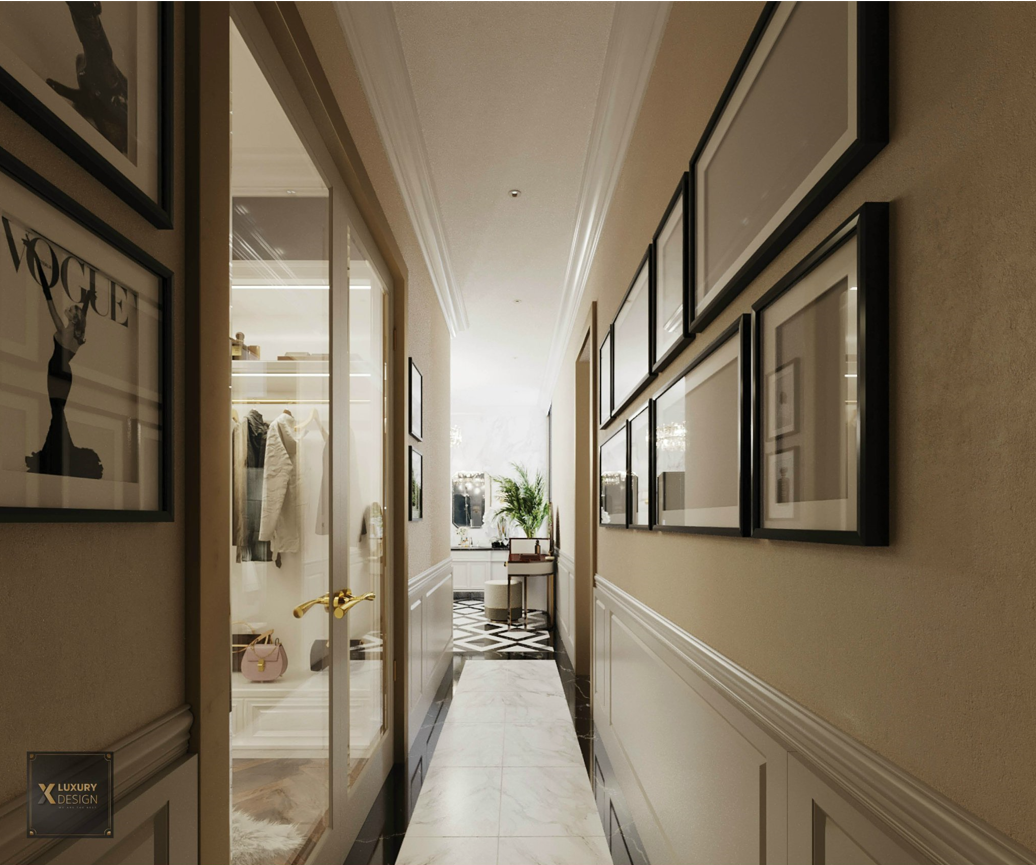 Một lối đi riêng từ phòng ngủ ra phòng tắm được trang trí nhiều tranh ảnh, không hề đơn điệu.