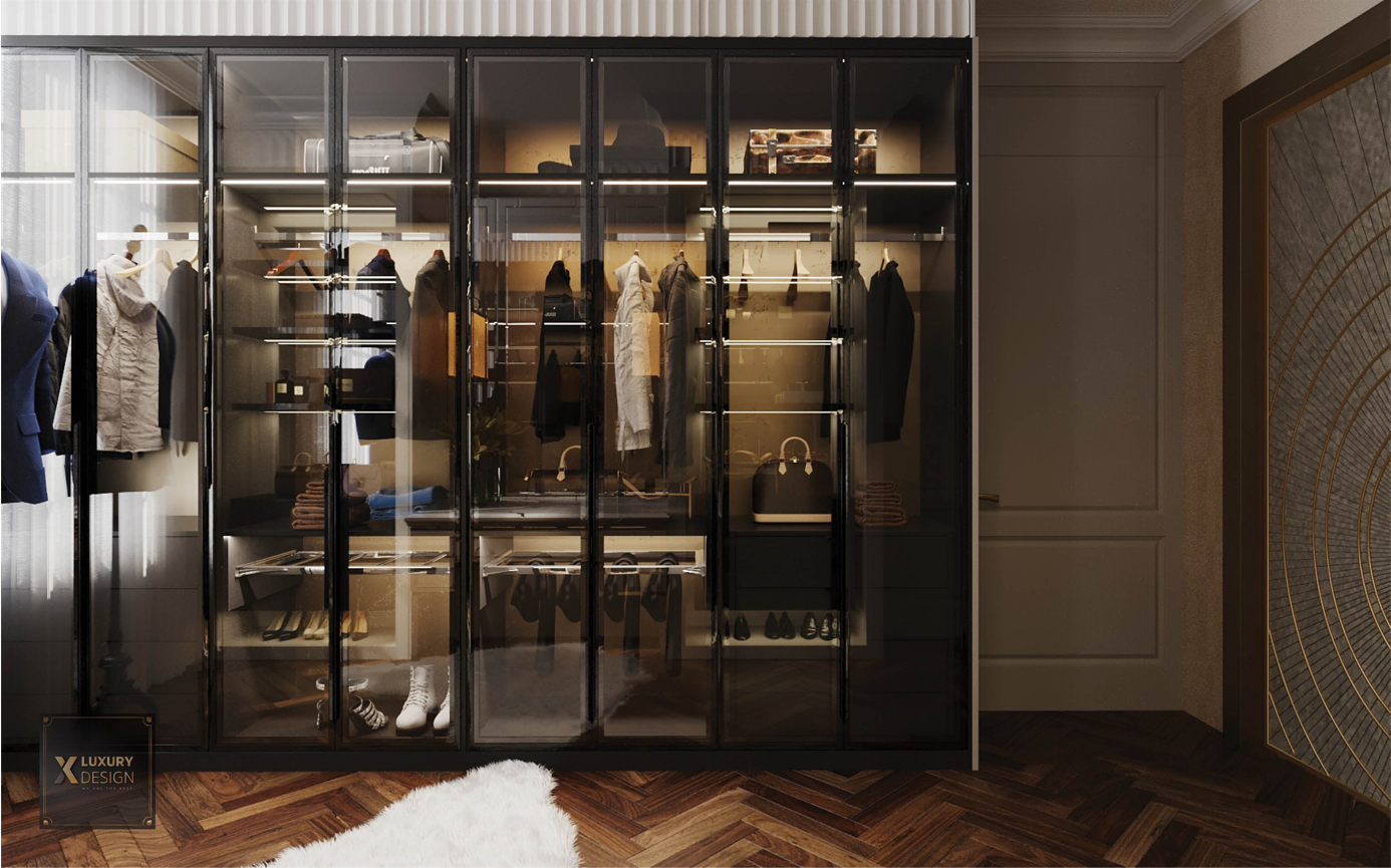 Phòng để thay đồ với của kính giúp căn phòng trở nên tinh tế, ấn tượng ngay từ lần nhìn đầu tiên.