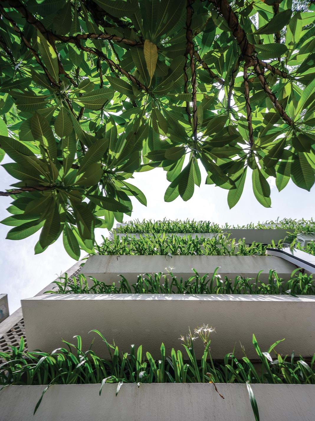 Mái vươn rộng, khối nhà lồi lõm, phủ cây xanh… giúp giảm lượng nhiệt truyền trực tiếp và nhiệt phản chiếu lên các bề mặt nhà Đối với mái dốc, dù lợp bằng vật liệu dày (tôn cách nhiệt, ngói, thậm chí đúc bê tông rồi dán ngói lên) thì vẫn phải lưu ý làm khoảng trống thông gió tạo vùng mát âm dưới mái.