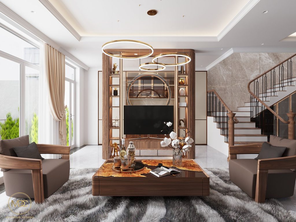 Sự phối hợp giữa gỗ tự nhiên cùng những vật liệu nội thất khác như: Tranh gương, thảm lông thú, đèn nghệ thuật, đồng hỗ gỗ. Tất cả tạo nên một không gian “Tân cổ điển” vô cùng sang trọng.