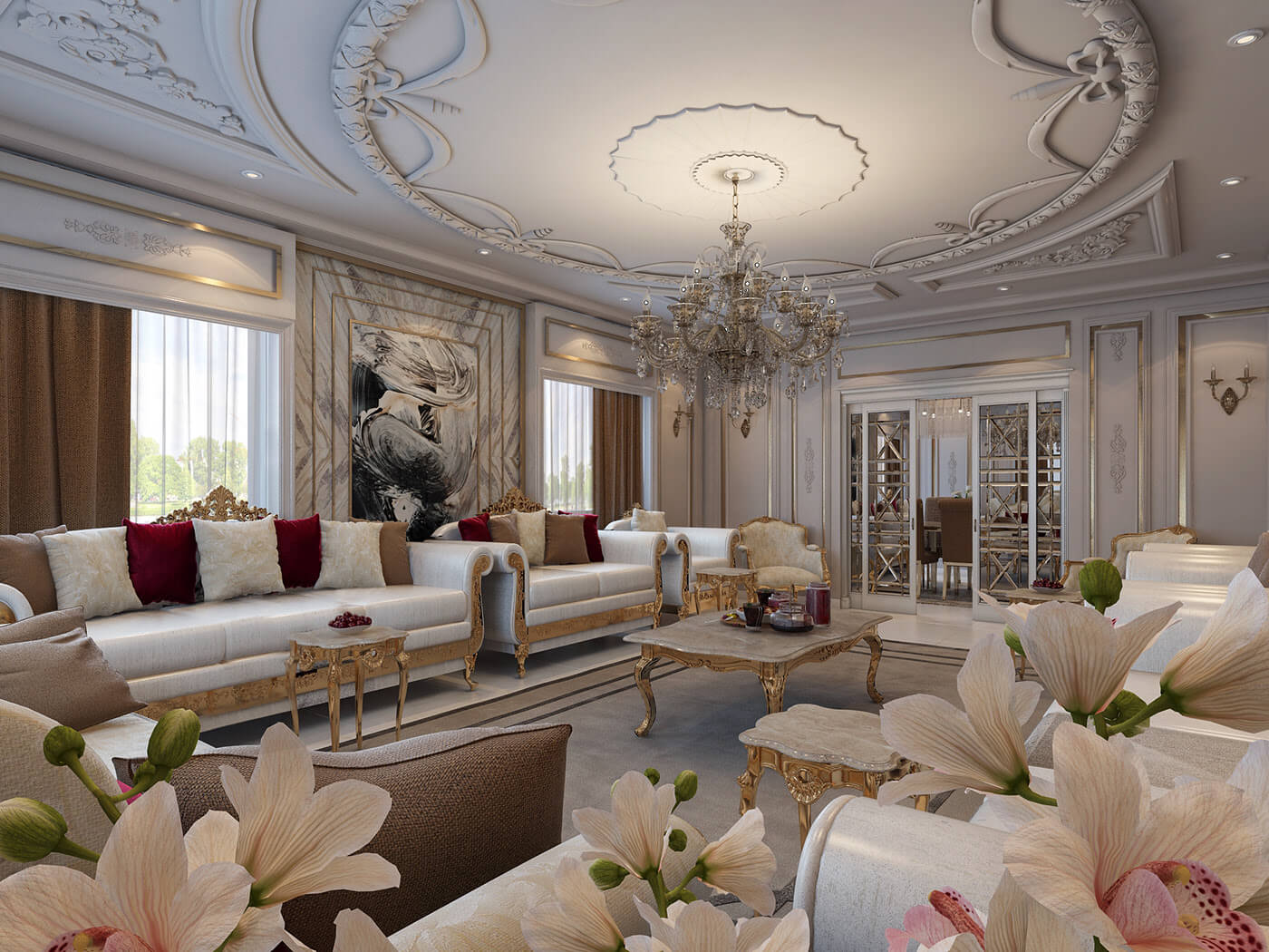 Phòng khách được thiết kế theo kiến trúc này thể hiện sự đẳng cấp của gia chủ. Căn phòng trở nên lộng lẫy và cuốn hút nhờ vào những đường nét hoa văn trang trí ở trần nhà và tường.