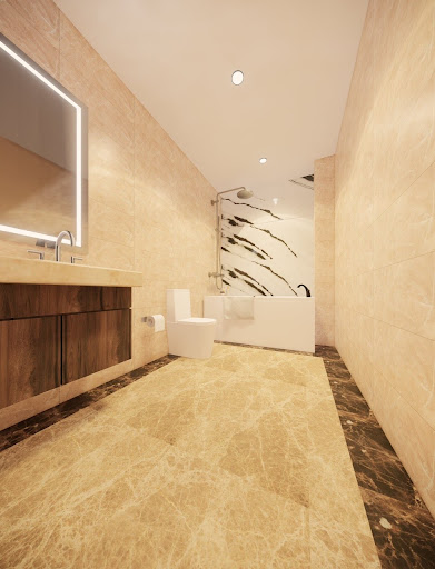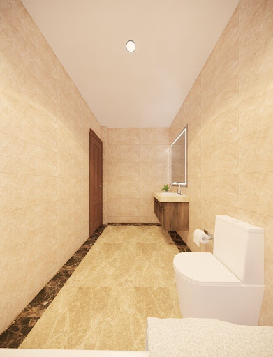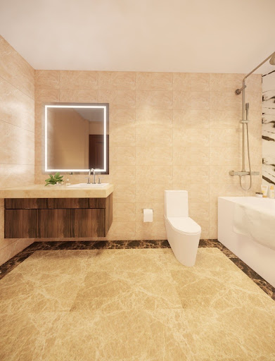 Sử dụng vật liệu gạch men cao cấp màu sáng tạo không gian phòng sang trọng và rộng rãi hơn. Toilet chất liệu sứ cao cấp, đá lát tường, sàn nhà tắm là loại đá Granite vân nâu nhạt sang trọng, bồn tắm, vòi sen đẳng cấp.