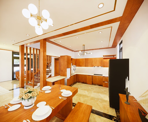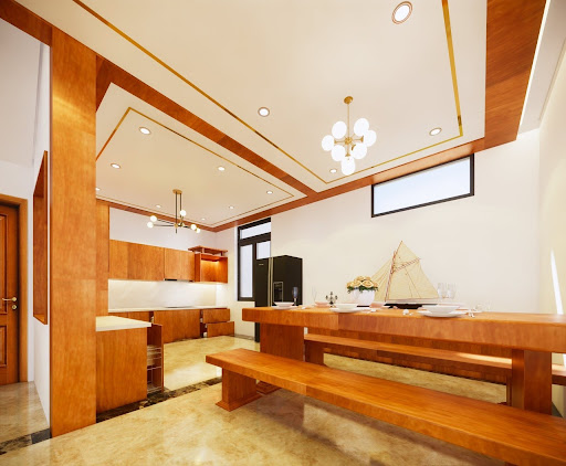 Từ bộ bàn ghế ăn, tủ bếp, trần nhà đều được làm bằng gỗ tự nhiên cao cấp. Không gian là sự kết hợp hài hòa giữa vật liệu hiện đại ( gạch men, kính,..) và vật liệu truyền thống, tất cả đã tạo nên một không gian sống vô cùng sang trọng và ấm cúng.