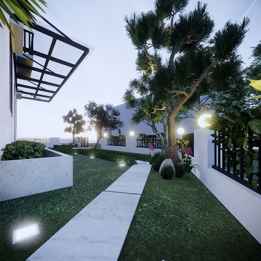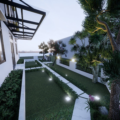 Tổng thể khu vườn căn biệt thự được thiết kế theo bố cục đối xứng và các loại cây xanh được cắt tỉa gọn gàng. Bên cạnh đó, các kiến trúc sư bố trí thêm hệ thống ánh sáng xung quanh căn nhà để thêm phần nổi bật và tươi sáng.