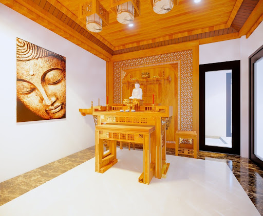 Nét độc đáo của phòng thờ là sự kết hợp giữa gỗ truyền thống với vật liệu đá cao cấp tạo cảm giác sang trọng và vô cùng ấm cúng. Ngoài ra, để tăng tính thẩm mỹ cho căn phòng thờ, gia chủ đã bố trí những bức tranh treo tường phật quan âm hợp phong thủy nhằm mang lại sự may mắn, bình an cho gia đình.